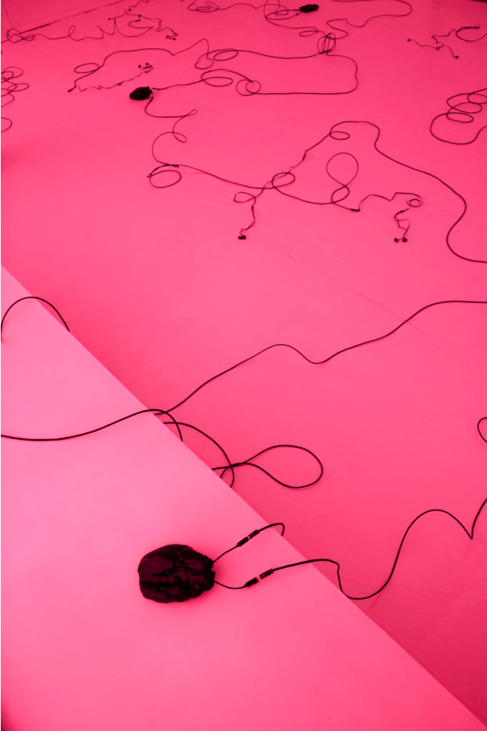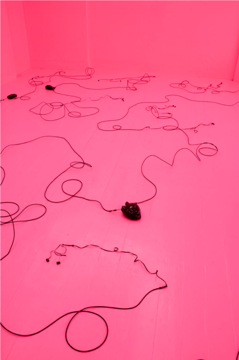 A play on the voice's and blood's ability to move between bodies, subjectivity, intersubjectivity, material and message. The installation incorporates an enclosed pink room and a series of black silicon organs, with internal audio devices playing different recorded pieces of prose. Long audio cables with in-ear headphones extend out of the sculptures, allowing the audience can connect onto the organs and listen to the recordings. The voice utilizes onomatopoeic tropes and theatrical procedures to inflect sharply punctuated texts, allowing words and sentencesto repeat and mutate within recursive sequences of digitalized breaths, shifting pitches and sexual aural tones.